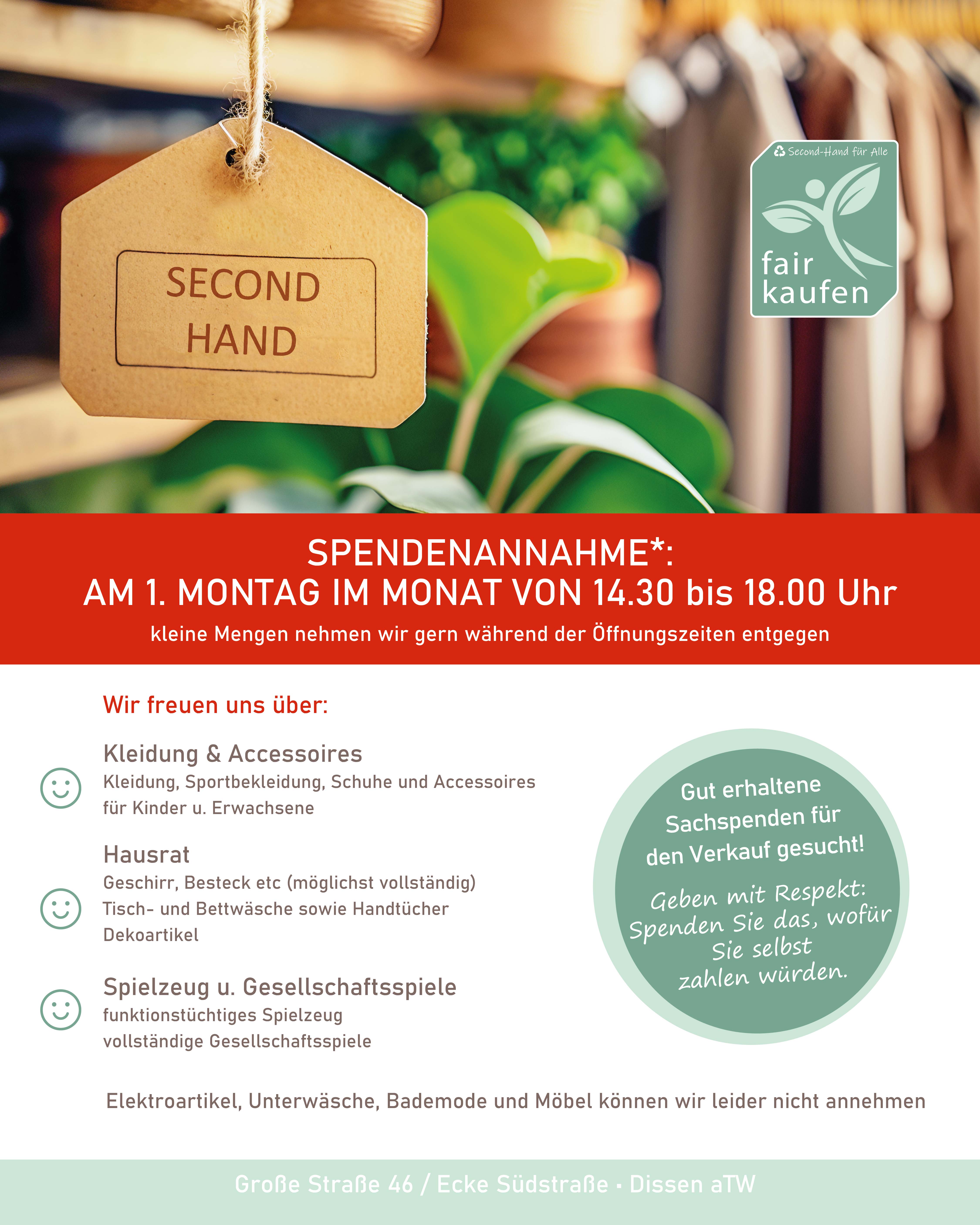Spendenannahme: am 1. Montag im Monat von 14.30 – 18.00 Uhr